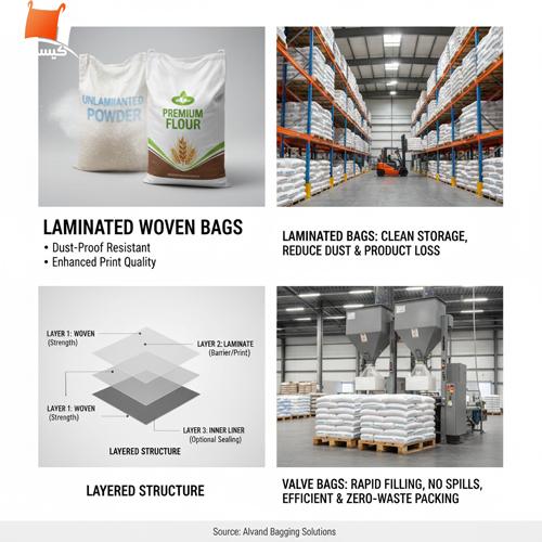 | نشت پودر و گردوغبار | لمینت بهتر + دوخت تقویت + در صورت نیاز لاینر | تمیزی انبار و افت ضایعات |